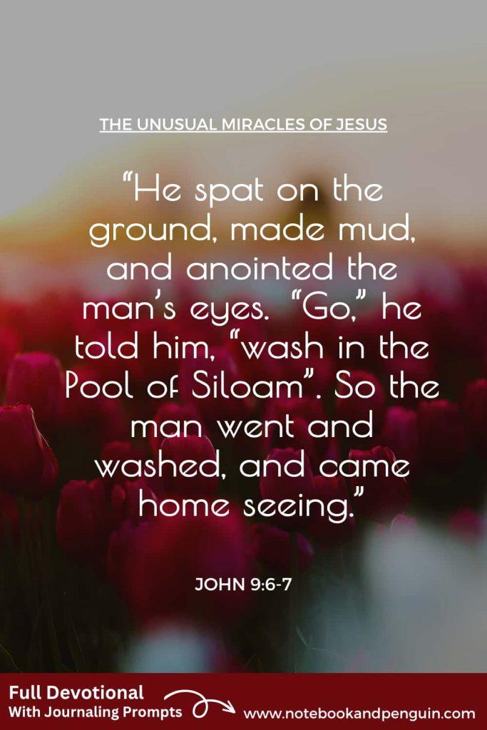 “He spat on the ground, made mud, and anointed the man’s eyes. “Go,” he told him, “wash in the Pool of Siloam” (this word means “Sent”). So the man went and washed, and came home seeing.”