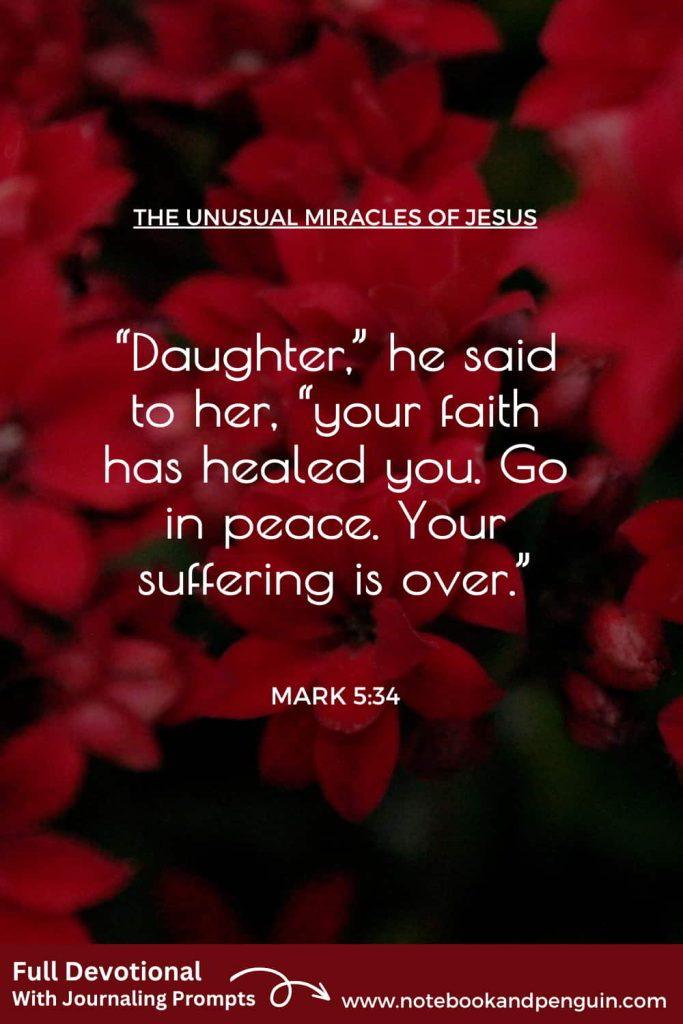 Daring Faith – When she heard about Jesus, she thought, “If I just touch His cloak, I will get well.”. She didn’t need His attention, His words, or even His acknowledgement. Her faith was so strong that she believed all she needed to do was touch Him to be healed. She risked everything and instantly knew she was healed!