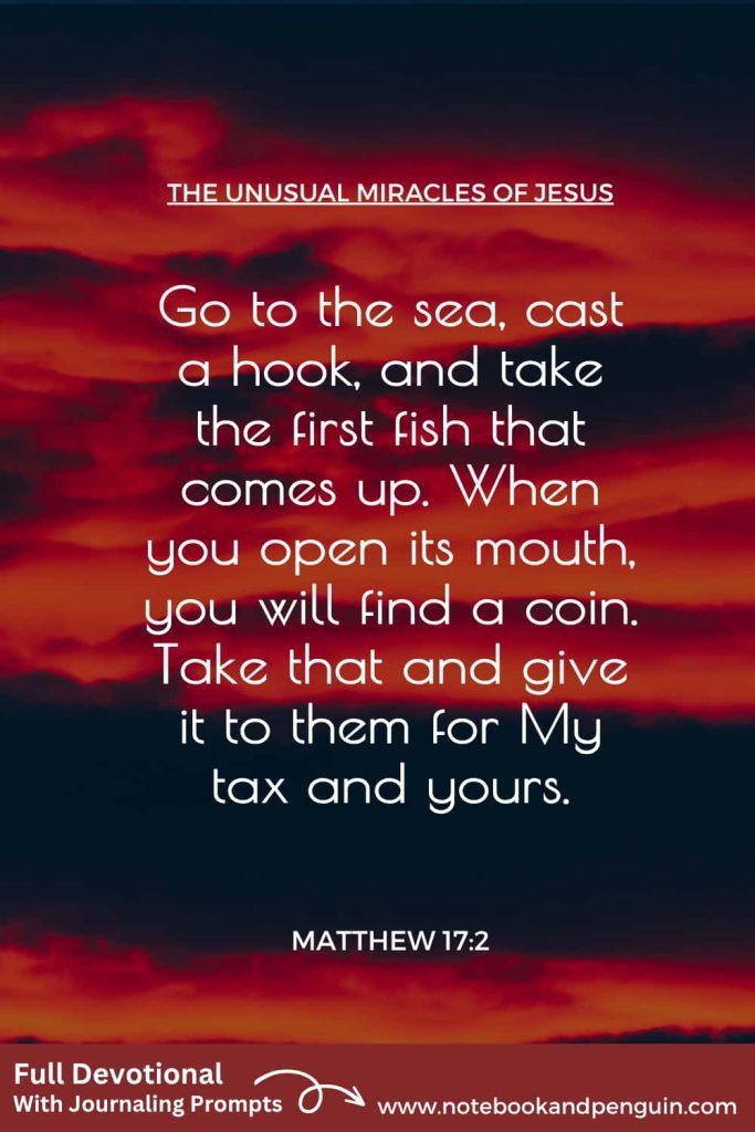 “Go to the sea, cast a hook, and take the first fish that comes up. When you open its mouth, you will find a coin. Take that and give it to them for My tax and yours.”